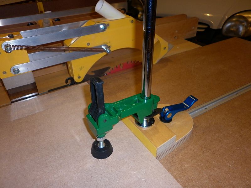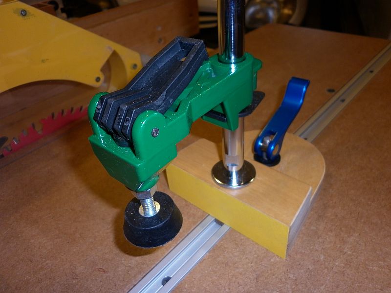 This simple hold-down is built around a drill press hold-down supplied by