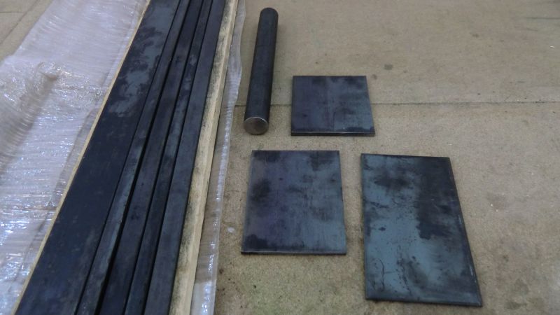 Here is all the required material. A round steel rod 30mm in diameter. Three metal plates and some flat strips plus 1m of ACME threaded rod (about 18mm in diameter) with two nuts.
