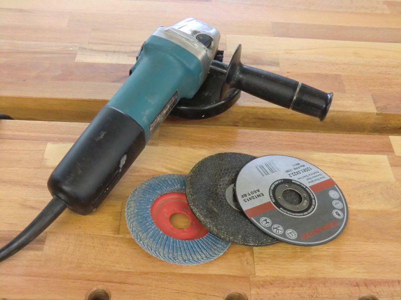 To start working you will need a angle grinder with 3 different disks: A very thin cutting disc (1mm thick), A thicker grinding disc (3mm or more) and a sanding flap disc.