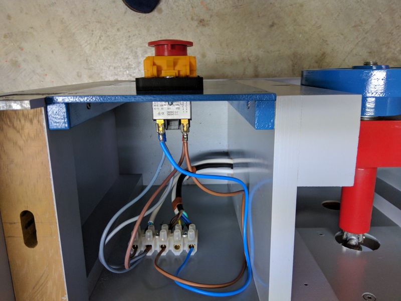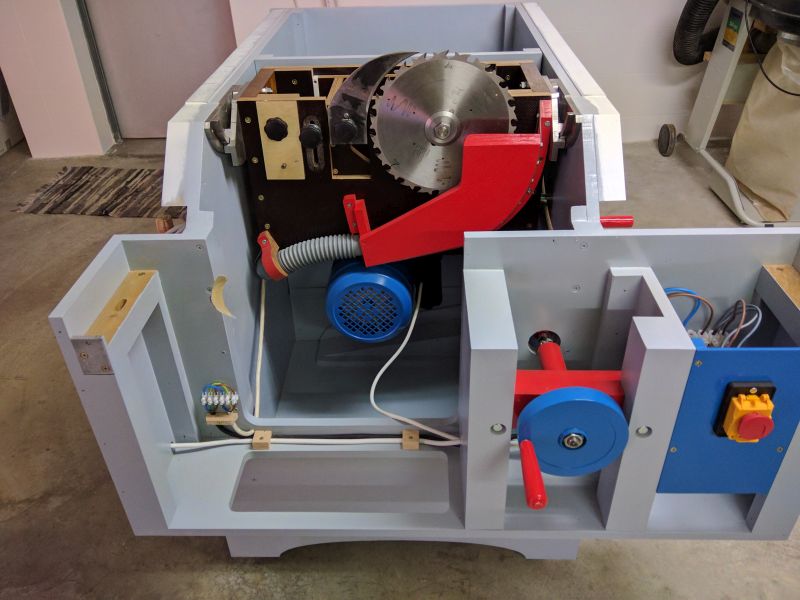 There is only a single switch to control the Saw. Pedro has a dedicated dust collector (partially seen at the back), so he will not be using the integral Thien Baffle. Note that a notch has been added at the left to clear the Blade Hood hose.