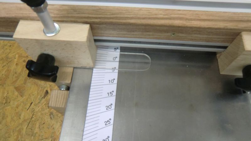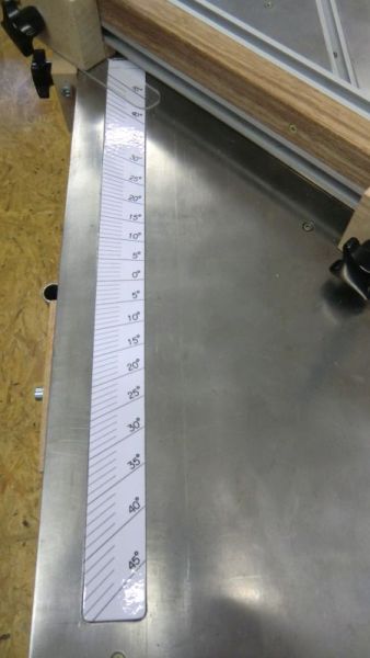 Close-up of the scale. I printed the scale from the plans on regular paper and glued it to the MDF with paper glue. I set the 0° exactly using the marked line on the MDF. Then I sanded the surplus paper flush with the MDF with 40 grit sandpaper. It is important that you do not round the edges of the MDF before attaching the scale. Leaving sharp edges will work better for sanding away the surplus paper.