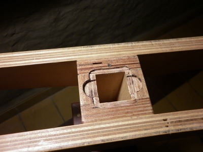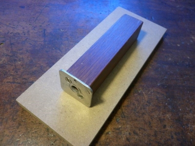 The back has two ply or MDF rectangles screwed so that the center space registers with the end of the stem. Their width is tailored to fit between the upper two sides of the stem.