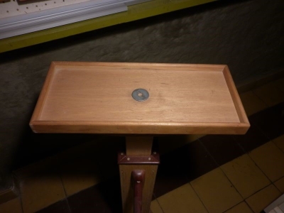 This is a tool tray. It has a hole at the center to plug-in a lamp if necessary. The plug is left below in order to keep the lamp stem vertical. I glued a fender washer over the hole to avoid the lamp base from damaging the wooden tray. It also makes rotating the lamp a lot smoother.