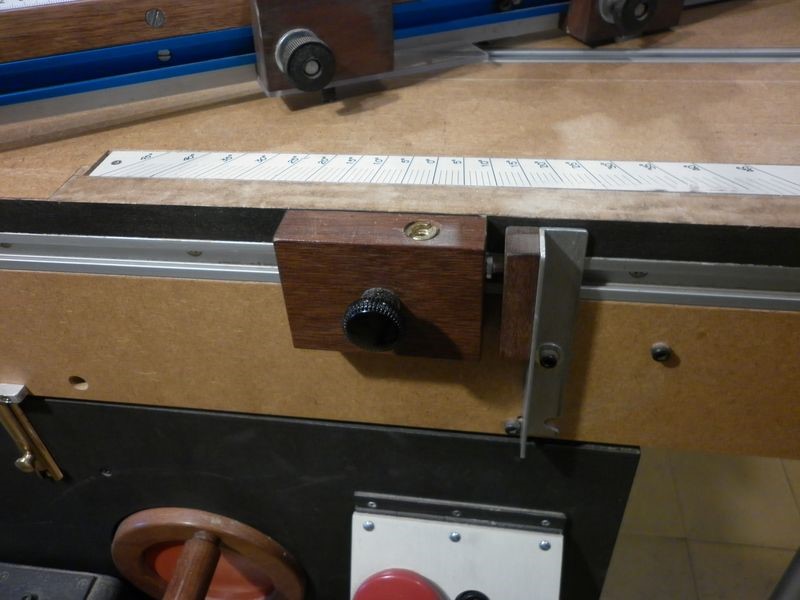 Once the fence is set at 0°, the flip-stop is set to e.g. 10cm and the whole unit is slid until the reading to the blade teeth has the same value. This completes the adjustement as in the previous case.