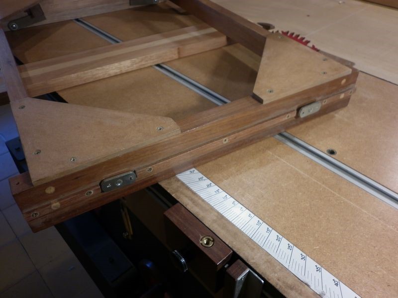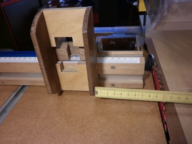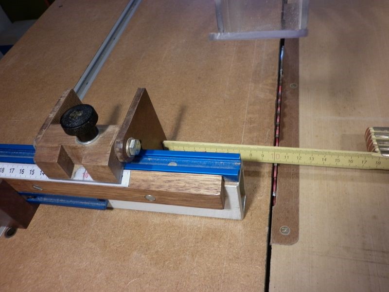 In this picture the flip-stop was set a 10cm and a wood folding rule used to slide the fence until the reading at the blade tooth was identical. This operation adjusts the unit so that the flip-stop cursor can be used to set the crosscut length without further measuring.