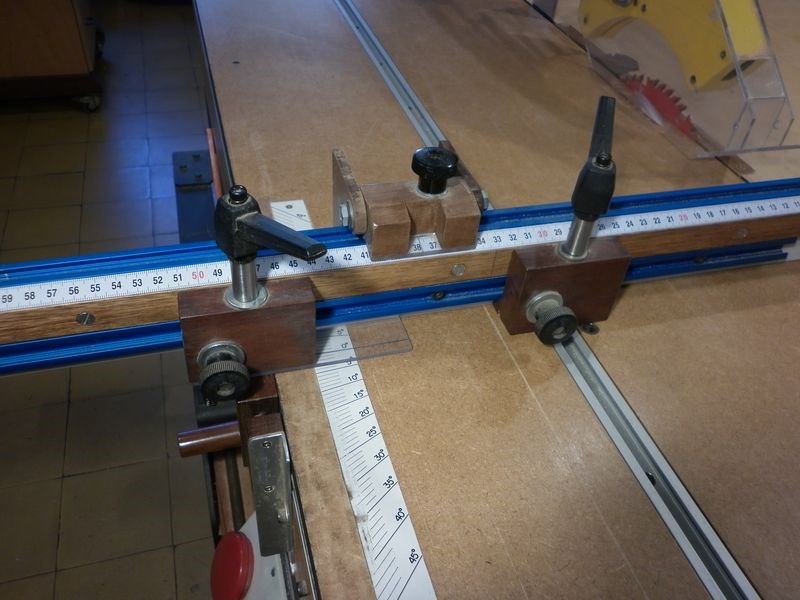 You can also adjust the Fence position relative to the saw blade by loosening the two round knobs on the front face of the ratchet-knob blocks. Therefore it is possible to shift the Fence towards or away from the blade.