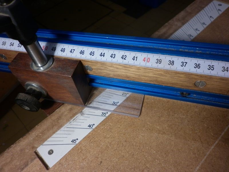Here the fence is set at 25° towards the operator. The left-hand scale is used with the fence positioned at the far end. The right-hand scale is used with the fence at the near end. At the upper right of the picture the adjustment screws can be seen. There is another pair at the other end.